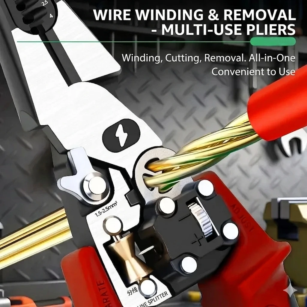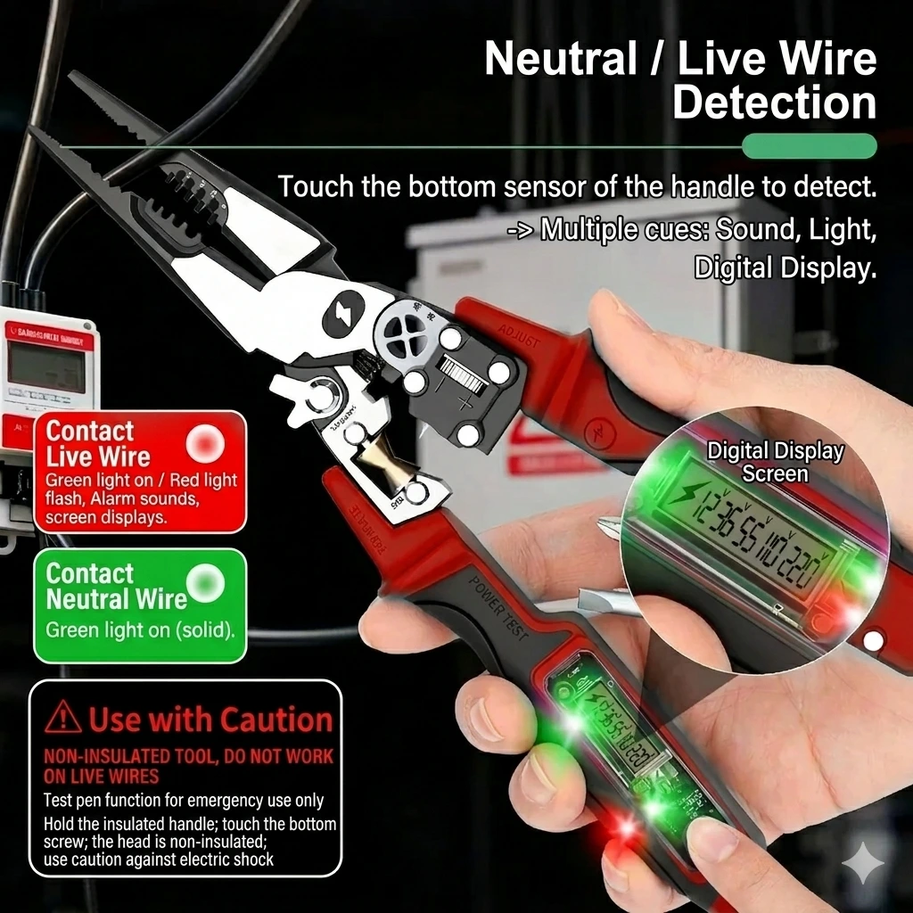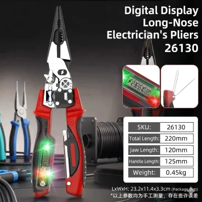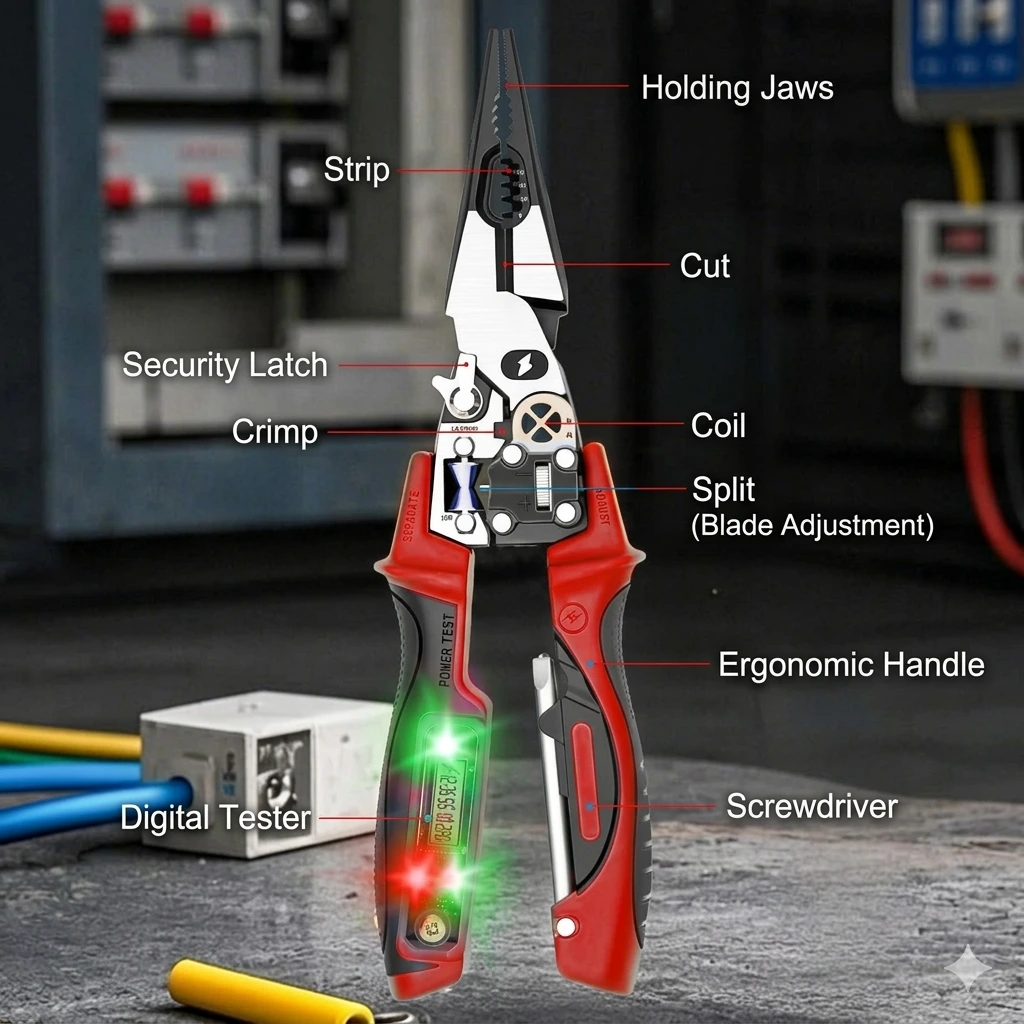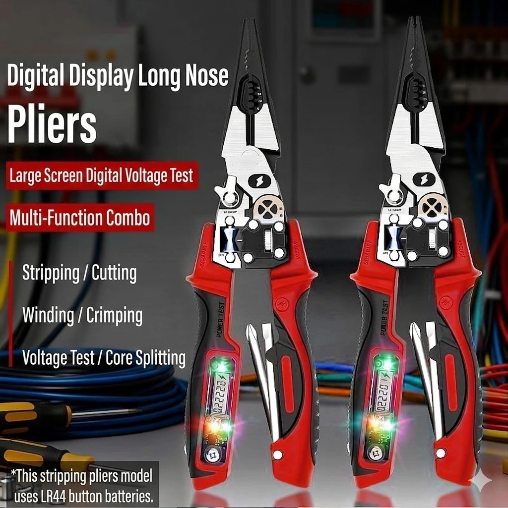 The Multi-Functional Electrician’s Pliers is the ultimate all-in-one tool designed for professional electrical work and home maintenance. Combining high-precision cutting and stripping with an integrated digital voltage tester and a concealed screwdriver, this tool eliminates the need to carry multiple heavy instruments. Whether you are winding wires, crimping terminals, or detecting live lines, this tool provides safety, efficiency, and ergonomic comfort.