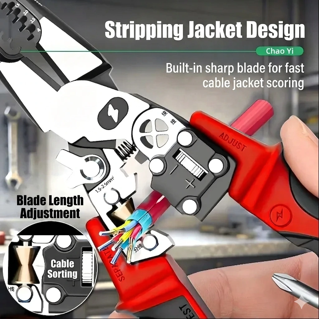 Precision Stripping & Cutting: Equipped with a built-in sharp blade and a Blade Length Adjustment dial for fast, accurate cable jacket scoring without damaging the core.
