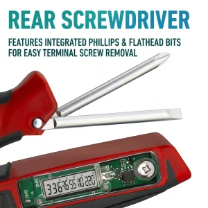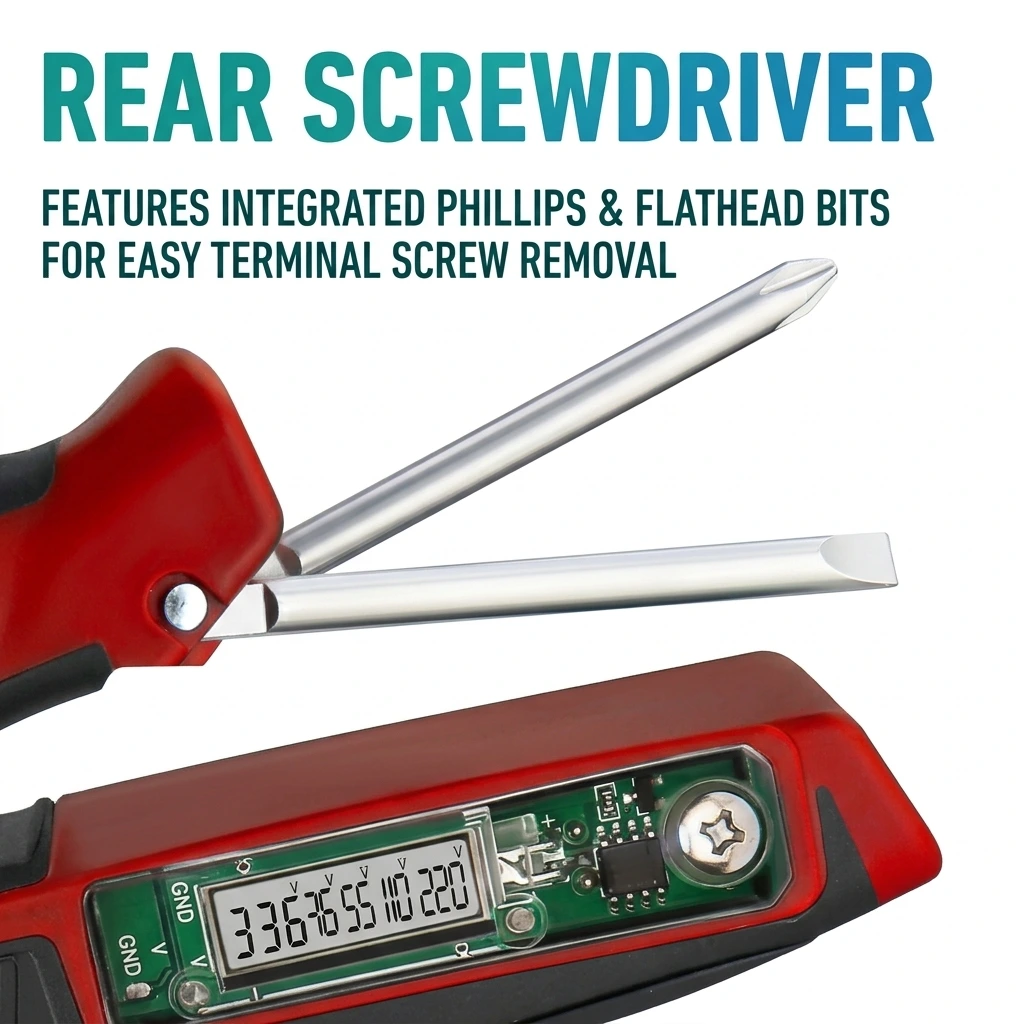 Concealed Rear Screwdriver: The handle features integrated Phillips and Flathead bits, specifically designed for easy terminal screw removal and installation.